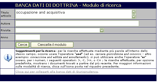 Altro esempio, riguardante questa volta la banca dati di dottrina. Immaginiamo di volere trovare tutti gli articoli riguardanti l'occupazione acquisitiva. A tal fine sarà sufficiente digitare nella casella del titolo dell'articolo le parole occupazione and acquisitiva.
