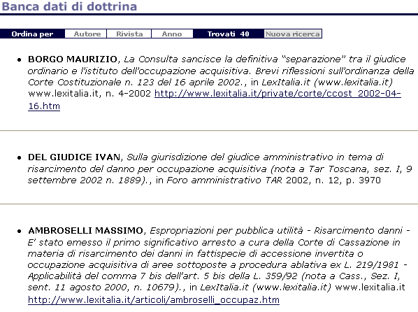 Nella pagina dei risultati della ricerca saranno mostrati tutti gli articoli riguardanti l'occupazione acquistiva. Gli articoli pubblicati nella presente rivista presentano anche un link che consente di consultare gli articoli stessi direttamente.