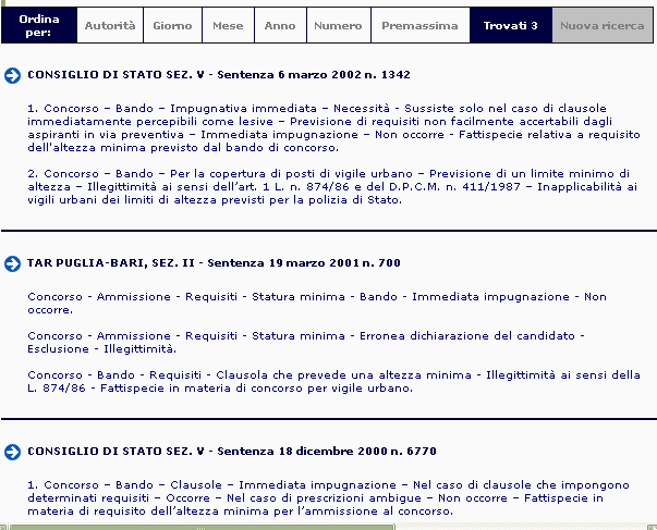 Riproduciamo qui di seguito tale pagina. Come si noterà, in alto è presente la barra di navigazione, che consente di ordinare i records trovati secondo vari criteri. La stessa barra mostra il numero dei records trovati (nella specie sono state trovate n. 3 pronunce che riguardano il requisito dell'altezza nei concorsi pubblici), nonchè un link che consente di effettuare una nuova ricerca con nuovi criteri.